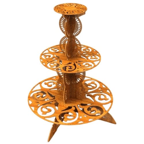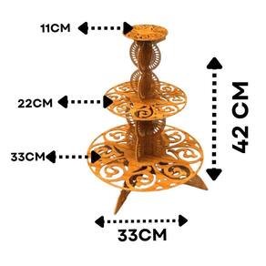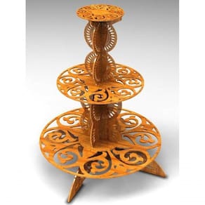 Bandeja De Bolo 3 Andares Com Detalhes Vazados Em Mdf Material MDF CRU 3 mm Formato Aplicado: Conforme a Imagem - Bandejas de 11, 22 e 33 cm de diâmetro Formato Montado: 1 peça Comprimento: 33 cm Altura: cm Largura: cm Peso Aprox.: 1200 gramas Acabamento: Corte a Laser sem pintura : Desmontada