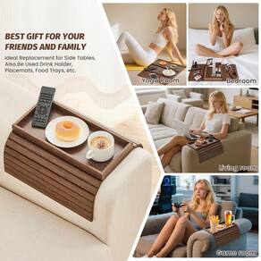 - ARMREST TABLE WITH SHAPE VERSATILITY: GEHE sofa arm tray is suitable for most wide sofas and it's foldable. The sofa armrest table can keep your sofa clean with a baffle design. Not just the sofa tray, put flatly, it can also be used as a computer tray table, drink holder, placemat, food tray, etc.