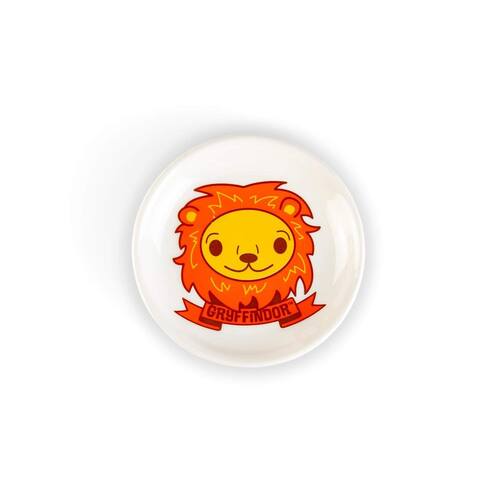 Comemore o mágico Mundo Mágico de Harry Potter com um pouco de fantasia! Esta linda bandeja de bugigangas de Harry Potter tem o tamanho perfeito para colocar itens pequenos! A bandeja redonda branca vidrada de 4 polegadas apresenta uma adorável imagem colorida de desenho animado do mascote do leão House Gryffindor, completa com banner! É uma peça de exibição colecionável fabulosa! Um presente mágico para qualquer trouxa que seja fã da série de livros ou da franquia de filmes Harry Potter! Mercadoria de Harry Potter oficialmente licenciada!