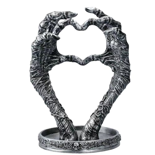 Material: Resina Tamanho: 10 cm* 20 cm Peso: 300 g Design de múmia gótica: esta escultura atraente apresenta um par de mãos esqueléticas em forma de coração, perfeita para adicionar um toque de elegância escura à decoração da sua casa. Bandeja de joias funcional: com uma bandeja embutida, esta escultura funciona como um prático suporte para anéis, pulseiras e outros pequenos itens de joalheria, combinando arte com funcionalidade. Artesanato em resina intrincada: feita de resina de alta qualidade, esta peça foi projetada com detalhes finos e um acabamento durável, tornando-a elegante e duradoura. Perfeita para decoração gótica ou escura: ideal para casas, estúdios ou quartos temáticos em estilo gótico, esta peça exclusiva serve tanto para iniciar uma conversa quanto para uma decoração elegante. Ótima para exibição: seja exibida em sua penteadeira, prateleira ou mesa, esta escultura artística à mão adiciona um toque ousado e elegante a qualquer sala ou coleção.