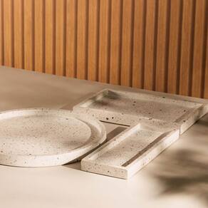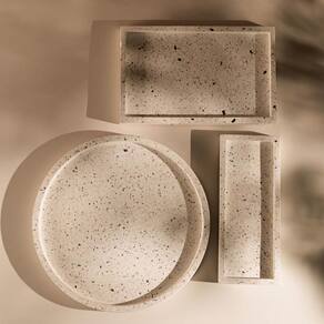 A bandeja é feita de mármore Terrazo, um tipo de mármore composto por pequenos fragmentos de pedra natural e outros materiais, criando uma superfície única e decorativa. A bandeja decorativa é projetada especialmente para ser utilizada na bancada do banheiro. Pode servir como um suporte elegante para itens de cuidados pessoais, como sabonetes, perfumes, aromatizadores ou outros acessórios decorativos.