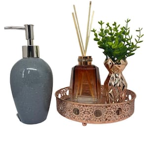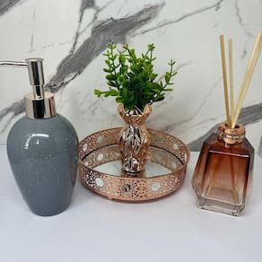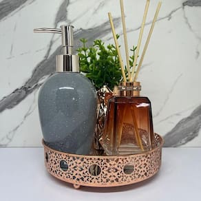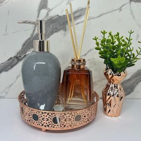 Kit decoração bandeja redonda de metal com fundo espelhado, difusor de vidro na cor marrom, porta sabonete líquido de cerâmica estampa granilite e vaso rose gold de cerâmica trabalhado.