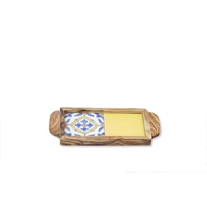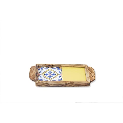 Esta linda bandeja de servir artesanal é feita de madeira de oliveira e decorada com azulejos pintados à mão.