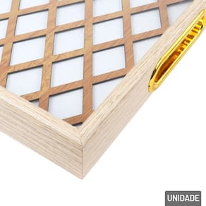 Bandeja Decorativa de MDF 28x41cm Alça Doura A Bandeja Decorativa de 28x41cm é mais do que um item utilitário, é uma peça de destaque na decoração. Com um visual moderno e refinado, ela combina estrutura resistente de MDF, alças de plástico douradas e um fundo transparente de acrílico decorado, criando um produto que une estilo, sofisticação e praticidade.\nFabricada em MDF de alta qualidade, suporta até 12,5 kg, ideal para uso tanto decorativo quanto funcional, seja para servir ou organizar. Garante firmeza no manuseio com um toque de luxo, harmonizando com diferentes estilos de decoração, do clássico ao moderno. Perfeita para lavabos, aparadores, penteadeiras, mesas de centro ou cantinhos do café.\nEspecificações:\nMarca : IMPORIENTE\nTipo de material : Acrílico, MDF, PS\nCores ou Estampa : Bege, Dourado, Transparente\nDimensões do Produto : 4 X 33,5 X 23 CM\nDimensões da Embalagem : 4 X 33,5 X 23 CM\nPeso Bruto (Gramas) : 0.318