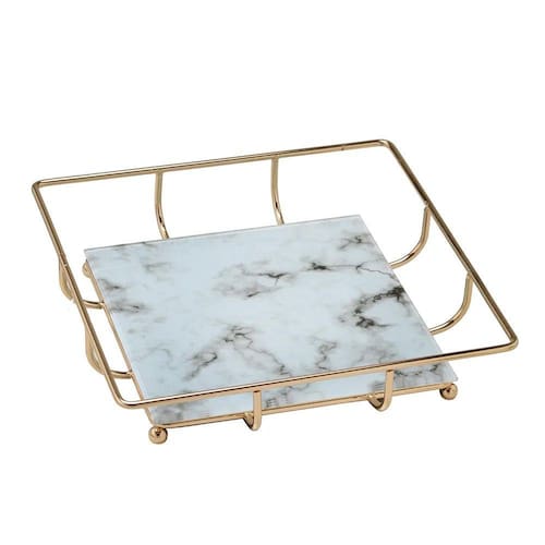Bandeja Decorativa Quadrada em Metal e Vidro Dourado