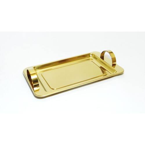 Bandeja Retangular Pequena Fineza Contém:1 Bandeja de aço inox com revestimento Dourado Dimensões: 30x17cm Toda a peça em aço inox de alto padrão com revestimento dourado de alta durabilidade. Recomendações de uso: Use apenas sabão ou detergente e o lado macio da esponja.Outros tipos de produtos, como palha de aço, poderão riscar ou prejudicar o brilho. Enxágue bem cada peça a fim de remover totalmente os resíduos dos produtos de limpeza, que, por serem abrasivos, podem prejudicar o inox. Sempre que possível, use água morna, pois renova o brilho do produto. Após a lavagem, enxugue imediatamente o mesmo, caso contrário, as substâncias químicas da água cloro poderão causar manchas. Na lavagem manual evite atrito entre o produto durante o processo de lavagem e no armazenamento, para mantê-los sem riscos. Não recomendado também, o uso de máquina lava louças. Ean: 7897373139177