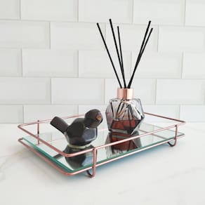 Ideal para decorar pequenos espaços, a bandeja espelhada rose gold dá um toque elegante ao ambiente. Com um espaço de uso de 25x15,5cm e capacidade para até 1kg você poderá dispor sobre a bandeja itens para decorar a bancada do banheiro e lavabo ou até mesmo a penteadeira com alguns perfumes sobre ela. A bandeja decorativa rose gold é prática e de fácil manuseio. Deixe seu ambiente sofisticado e moderno.