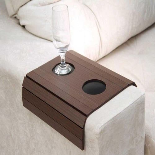 Bandeja Esteira para Braço de Sofá Cor Imbuia com Porta Copos A Bandeja para Sofá é um item hoje indispensável em sua casa! Além de ser um lindo objeto de decoração, é super funcional, serve para colocar copos, pratos, taças, notebook. Especificações - Cor: Imbuia; - Flexível; - Com Porta Copos; - Adaptável em qualquer sofá; - Dimensões: 30 x 44 cm.