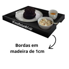 Dimensões: Comprimento: 43 cm Largura: 29 cm Altura da borda: 4 cm Corte à laser - extrema qualidade e acabamento; Frase cantinho do café em mdf preto na parte frontal; Possui alças para uso como bandeja; Excelente peça decorativa; Fabricado em madeira de reflorestamento;