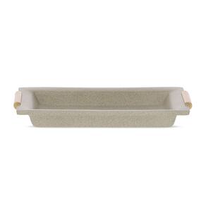 Fabricada em poliresina de alta qualidade, a travessa é leve, resistente e apresenta um acabamento que imita a textura de pedras ou granilite, garantindo um visual sofisticado e contemporâneo. As alças, além de um belo detalhe decorativo, proporcionam facilidade e segurança no manuseio.