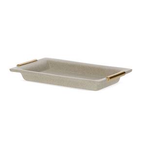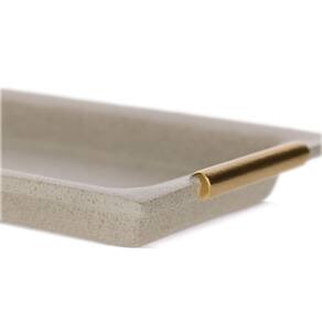 Design: Retangular, com alças laterais em tom dourado.Cor: Bege/creme, com textura sutil que simula granilite.Material: Poliresina de alta qualidade (não vai ao forno).Dimensões: 4 cm (Altura) x 27 cm (Largura) x 17 cm (Profundidade).Versatilidade: Ideal para servir aperitivos, organizar objetos maiores ou como um elemento decorativo de destaque.Estilo: Elegante, moderno e funcional, eleva a apresentação e a decoração de qualquer ambiente.