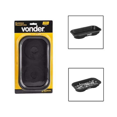 Especificações: - Marca: Vonder; - Modelo: 3599240140; - Material da bandeja magnética: Plástico; - Formato: Retangular; - Base: Magnética; - Tamanho: 140 mm x 240 mm; - Profundidade da bandeja magnética: 30 mm; - Peso: 0,635 kg; - Indicada para armazenagem de pequenas peças e componentes metálicos, tais como: parafusos, pregos, porcas e grampos;