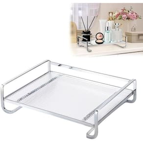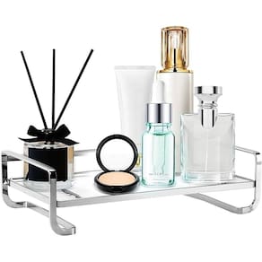 A Bandeja Multiuso com Alça Prata 15x27cm pode ser usada como suporte para penteadeira no quarto, prateleira para bancada, bandeja para caixa acoplada do vaso sanitário, bandeja para pia de cozinha, bandeja para toalhas de hóspedes para armazenar perfumes, cosméticos, produtos para a pele, loções, fragrâncias, toalhas, papel, velas, joias, acessórios, anéis, relógios, chaves, sabonetes e dispensadores de sabonete.