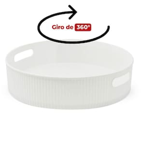 Bandeja Organizadora Redonda Base Giratória Branca Bandeja multiuso com base que gira 360 graus, perfeita deixar seus armários mais organizados e também facilita na hora de pegar os itens guardados nela. DICAS DE USO - Cozinha - Em armários para guardar copos, temperos, potes e etc..- Lavanderia - Organizar seus produtos de limpeza, como sabão, amaciante e etc..- Banheiro - Serve tanto para organizar os cosméticos como também toalhas, papeis... PRINCIPAIS DESTAQUES: - Dimensões 30,5 x 8,5 cm (largura x altura)- Possui base giratória 360 graus- Possui pés emborrachados na base que evitam que a bandeja escorregue- Possui alças laterais que facilitam no manuseio- Relevo Canelado
