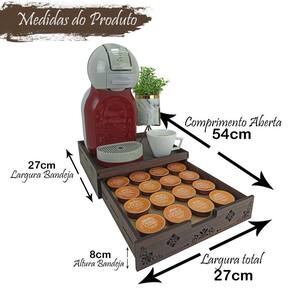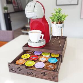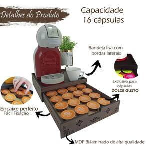 Bandeja para cápsulas Dolce Gusto Para 16 capsulas café chá Monte hoje mesmo seu cantinho do café com nossa bandeja compacta... Este é o produto ideal para você Nossa bandeja é feita em MDF bi-laminado de alta qualidade;Possui espaço para sua cafeteira e também xícaras na parte superior.Além disso, possui uma gaveta, com capacidade para 16 cápsulas. Nada melhor que uma peça que te faça otimizar espaço, e que também suporte às suas necessidades, de uma maneira que facilite para o seu dia-dia. Esta peça tem todas essas qualidades e vai deixar o seu cantinho do café ainda mais aconchegante. Dimensões: Altura total da bandeja: 8cmAltura da Gaveta: 5,5 cmComprimento: 27cmLargura: 27cm Capacidade para 16 cápsulas Dolce GustoOBS: Cápsulas e acessórios não acompanham o produto