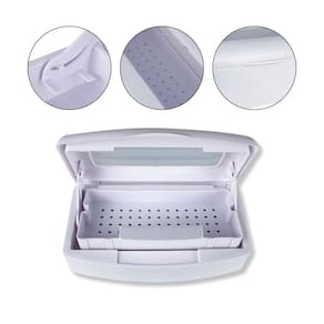 Possui um design com uma tampa com visor transparente e uma bandeja removível perfurada interna, permitindo a circulação do agente esterilizante.