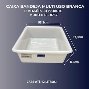 Caixa Bandeja Multi uso branca 12 litros A bandeja de polipropileno Bioprátika Multi uso é um item indispensável para qualquer estabelecimento, seja ele uma cozinha doméstica ou industrial, refeitórios, padarias, pastelarias, lanchonetes ou mercados. Confeccionada em plástico polipropileno, esta bandeja não contém bisfenol, tornando-a uma opção segura e saudável para o armazenamento de alimentos. Com medidas externas aproximadas de 53,2 cm de comprimento, 37,3 cm de largura e 8,6 cm de altura, a bandeja é retangular, o que facilita o armazenamento e organização. O modelo DF-0757, da marca daifpro, é versátil e funcional, sendo ideal para armazenar carne, peixe, frango, , legumes, frutas e até mesmo objetos. Além disso, a bandeja é apta para uso em lava-louças, o que facilita a limpeza e manutenção Diária. No entanto, não possui pés dobráveis. A bandeja de polipropileno Bioprátika Multi uso é perfeita para uso em freezers e microondas, tornando-a uma opção prática e eficiente para o dia a dia. ESPECIFICAÇÕES Comprimento: 53,2cm Largura: 37,3cm Altura: 8,6cm Capacidade: 12 Litros