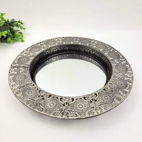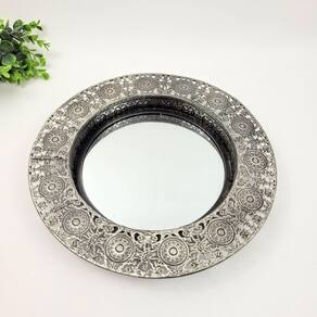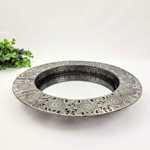 Bandeja Prata Redonda Metal Com Espelho 30cm P as bandejas tem a função não somente de servir, como também de decorar ambientes como salas e banheiros. Confira essa linda bandeja feita em metal, rica em detalhes, e com espelho. Elas dão elegância ao seu ambiente e seus objetos estarão sempre bem organizados Transforme a sua decoração utilizando bandejas.