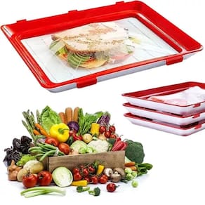 A bandeja possuí papel filme elástico transparante (fácil visualização) e resistente embutido que armazena os alimentos de forma compacta (a vácuo). Você ocupa menos espaço e armaneza mais alimentos em sua geladeira!
