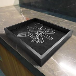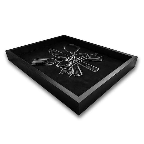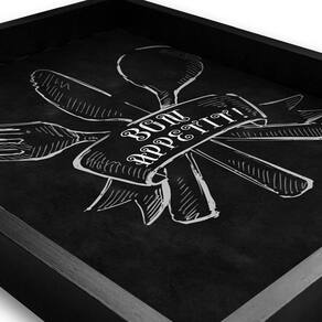 Atualmente, objetos decorativos tem cada vez mais ganhado seu espaço e se tornando indispensáveis na decoração de nossos lares, escritórios, consultórios e afins. Peças decorativas com funcionalidade são a combinação perfeita para os amantes da decoração e da praticidade. Por isso apresentamos para vocês a Bandeja Preta com Gravura "Bon Appetit", além de ser impermeável, possuí um visual moderno e traz consigo um conceito muito utilizado atualmente na arquitetura e decoração de ambientes, esse item sem dúvidas agregará requinte e muito estilo ao seu espaço. São muitas qualidades para um produto. Adquira já o seu! Dimensões Altura: 3 cm; Largura: 31 cm; Profundidade: 41 cm; Especificações do Produto Estrutura: MDF; Garantia: 90 dias contra defeito de fabricação; Montagem: O produto vai montado; Instruções de Limpeza: Utilizar um pano limpo e levemente úmido; Você irá receber: 01 volume; Observações Relevantes - Todos os produtos vão embalados com total segurança; - As cores dos produtos podem sofrer alterações dependendo do seu monitor; - As imagens são meramente ilustrativas, não acompanham objetos de decoração e eletros; - Confira as dimensões do produto no momento da compra e certifique-se de que passará normalmente por escadas, elevadores, portas e corredores. - Não nos responsabilizamos no ato da entrega por montagens, desmontagens, instalações de produtos, nem utilização de guinchos ou equipamentos similares para acesso a pisos superiores em apartamentos. - Observando as orientações acima, evita-se futuros desagrados ou imprevistos com a entrega do produto. Havendo despesas adicionais, serão de responsabilidade do cliente.