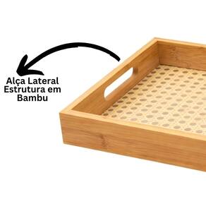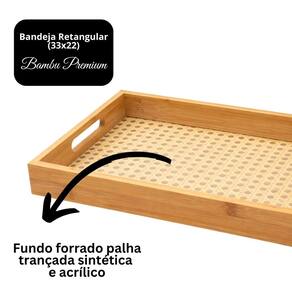 Com dimensões de 33cm x 22cm x 4,5cm, possui estrutura em bambu com fundo em palha sintética trançada e forro interno em acrílico fosco, oferecendo maior resistência, facilidade de limpeza e proteção contra umidade.