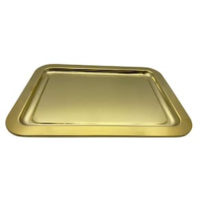 A bandeja retangular dourada em aço inox tem as seguintes medidas: 35cm x 24cm.