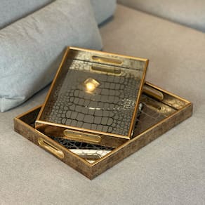 A bandeja retangular dourada craquelada traz um toque de sofisticação para qualquer ambiente. Ideal para ocasiões especiais ou para elevar o dia a dia com elegância.