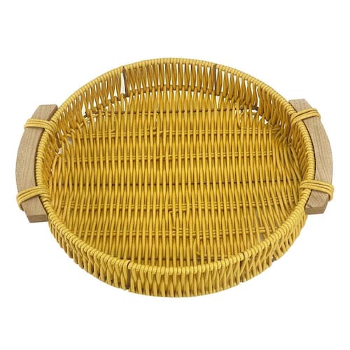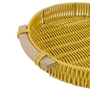 Bandeja Trama Tipo Vime Artificial Redonda Alça de Madeira Cor: Amarelo Adicione um toque de charme à sua casa com a Bandeja Trama Tipo Vime Artificial Redonda com Alça de Madeira Perfeita para servir petiscos, bebidas ou para organizar pequenos itens, essa bandeja combina a beleza do vime com a rusticidade da madeira. Sua alça facilita o transporte, tornando-a ideal para festas e reuniões familiares.