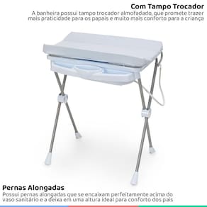 Banheira infantil a banheira de bebê plástica classic da galzerano é a mais completa. Por ser modelo 2 em 1, o tanque pode ser utilizado tanto no suporte quanto fora dele, trazendo praticidade para o dia a dia, além de possuir pernas alongadas que se encaixam perfeitamente acima do vaso sanitário e a deixam em uma altura ideal para conforto dos pais. Dispõe de saboneteira, porta shampoo e tampo trocador almofadado que facilitam a rotina de banhos aos pequenos. Dispõe de tampo trocador com tecido impermeável que descomplica a higienização e auxilia nas trocas de fralda e roupas do bebê. Além de tudo, acompanha assento redutor, viabilizando que seja aproveitada desde o nascimento do bebê. A banheira conta também com válvula de escoamento de água logo no tanque, com mangueira dobrável inclusa, simplificando sua desinstalação e armazenamento após o uso. A banheira de bebê plástica classic da galzerano vai facilitar a hora do banho para os papais, trazendo praticidade para a família. Informações da banheira: - marca: galzerano - modelo: classic - cor: azul - idade mínima recomendada: a partir do nascimento - composição material: plástico, aço, pvc - peso máximo suportado: 20 kg peso do bebê + água - 2 em 1: o tanque pode ser utilizado tanto no suporte quanto fora dele - com saboneteira e porta shampoo - inclui tampo trocador almofadado com tecido impermeável facilitando a higienização - acompanha redutor para recém nascidos - dispõe de válvula de escoamento de água - acompanha mangueira dobrável - medidas aproximadas da banheira com tampo trocador fechado axlxc : 98x80x66 cm - medidas aproximadas da banheira com tampo trocador aberto axlxc : 123x80x66 cm - medidas aproximadas do interior do tanque axlxc : 19x62x37 cm - medidas aproximadas do trocador axlxc : 8x80x49 cm - medidas aproximadas da banheira com estrutura fechada axlxc : 19x80x52 cm - medidas aproximadas da banheira avulsa axlxc : 20x75x46 cm - medidas aproximadas da embalagem axlxc : 55x83x28 cm - peso aproximado da banheira completa: 7,7 kg - peso aproximado da embalagem: 8,7 kg conteúdo da embalagem: - 1 banheira - 1 redutor - 1 mangueira - 1 manual de instruções