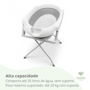 Características do Produto: Alta Capacidade: Comporta até 35 litros de água, uso direto no chão, ideal para um banho relaxante. Uso com ou sem suporte: adaptável a diferentes espaços e fases Almofada ergonômica com 3 alças ajustáveis: mais conforto e apoio para o recém-nascido Estrutura dobrável: compacta, leve e fácil de guardar Tampa de drenagem com sensor térmico: muda de cor com a água quente Porta-sabonete integrado: praticidade durante o banho Mangueira para escoamento da água com facilidade Suporte dobrável com pés antiderrapantes e trava de segurança Superfície interna lisa: fácil de higienizar Design moderno e funcional