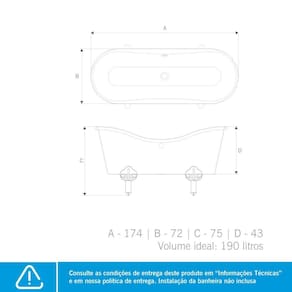 Inspirada no período vitoriano, a banheira de imersão Londres possui design clássico e conceito freestanding. Além disso, possui inclinação no encosto para garantir um maior conforto. Fabricada em acrílico. Acomoda uma pessoa. As cores do produto podem sofrer variações de acordo com o monitor, a iluminação do ambiente ou a sua percepção visual. Fotos meramente ilustrativas. Os objetos que compõe a foto ambientada não acompanham o produto. Peso por Caixa: 36.936399999999999Kg Aba Lateral: Não Aba para pés: Não Acompanha Aquecedor: Sem Aquecedor Acompanha Manual de Instalação: Sim Acompanha Motobomba: Não Air Blower: Não Alças de Apoio: Não Altura: 78 Ambiente Principal: Banheiro Apoio de Cabeça: Não Cascata: Não Certificado: Normatização: Certificadas pela OCP 0018 de acordo com as normas ABNT NBM NM 60335-1:2010 e IEC 60335-2-60:2008-09, conforme a Portaria INMETRO N.º: 371 DE 29/12/2009 Composição: Acrílico e fibra de vidro Comprimento: 174 cm Cromoterapia: Não Dispositivo de Sucção: Não Ducha com desviador: Não Entrada de Água: Sim Entrada de Ar: Não Formato: Oval Kit Hidráulico: Não Largura: 72 cm Litros: 190 Manual de Montagem e Instalação: https://cdn2.madeiramadeira.com.br/atributo/astra-banheiras/952109-arte-manu-bi-curvas-view.pdf Necessita Instalação: Sim Origem do Produto: Nacional Peso: 47.78 Possui Pés: 04 Quantidade de Lugares: 01 Recomendações de Uso, Manutenção e Limpeza: Para limpeza, utilize flanela e sabão/detergente neutro. NUNCA UTILIZE: produtos a base de álcool, cloro ou amônio. Produtos abrasivos (tipo sapólio, esponja de aço etc). Solvente (tipo acetona, benzina, éter etc). Para manter o brilho da peça utiliza: flanela e lustra móveis. Sistema de Som: Não Sistema instala fácil: Não Tubulação de Água e Ar: Não Válvula de saída de água: Sim