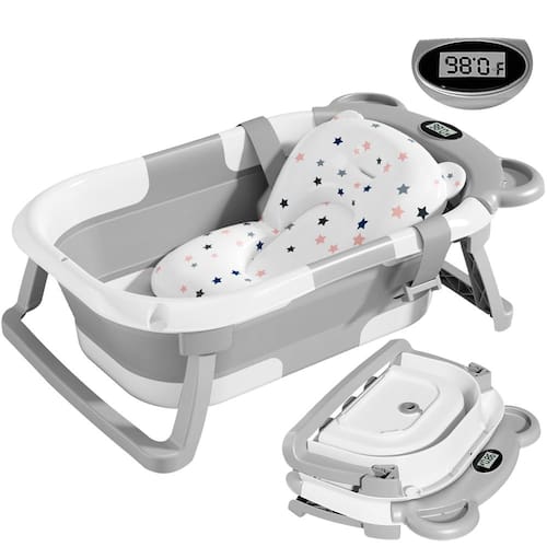 A banheira dobrável para bebês é projetada para acompanhar seu bebê de recém-nascido a criança, fofa e prática. O ralo externo possui um plugue de borracha fácil de puxar para simplificar a drenagem sem mover a banheira. Permite que o bebê tenha um banho confortável e agradável. Nome do produto: Banheira dobrável para bebês. Material do produto: PP+TPE. Dimensões desdobradas: 67 x 42 x 21 cm. Cor do produto: cinza. Os produtos incluem: 1 banheira dobrável para bebê, 1 tapete flutuante. Características: 1. A banheira de bebê para recém-nascidos adota um design de espaço ampliado e alargado, que é estável e tem uma forte capacidade de carga. Permite que o bebê aproveite uma hora de banho feliz. 2. Esta banheira de bebê com termômetro tem um dispositivo inteligente de detecção de temperatura, que pode exibir a temperatura em tempo real para evitar que o bebê seja escaldado ou pegue um resfriado. 3. Esta banheira infantil exclusiva é um presente atencioso para qualquer casal grávida. É adequado para bebês de 0 a 36 meses. Use sob supervisão de um adulto. Não deixe o bebê sozinho para evitar afogamento. - Design dobrável dobrável: TPN banheira dobrável para bebês apresenta um design engenhoso de dobra dupla, medindo de forma compacta menos de 10 cm de espessura. Isso facilita o armazenamento sem esforço em qualquer canto e melhora a portabilidade para conveniência em movimento, tornando-o um companheiro perfeito tanto em casa quanto durante a viagem. O ralo fora do chão com um plugue de borracha fácil de usar garante uma drenagem perfeita sem a necessidade de realocação. - Monitoramento de temperatura visível em tempo real: a banheira de bebê adequada para viagens está equipada com um sensor de temperatura em tempo real, oferecendo lembretes instantâneos para evitar queimaduras ou exposição à água fria. O sistema de bloqueio de temperatura envolvente garante monitoramento preciso, tornando-o uma escolha versátil para uso em banheiros, residências, durante viagens ou acampamento. - Enchimento confortável com almofada removível: nossa banheira de bebê para recém-nascidos vem completa com uma almofada removível para pendurar, oferecendo suporte ideal para a cabeça e o pescoço delicados. A almofada macia flutua sem esforço na superfície da água, criando uma experiência confortável e agradável, minimizando a agitação durante a hora do banho. - Design adorável: Projetado em forma de urso encantador, nossa banheira de chá de bebê adiciona um toque encantador à hora do banho, criando uma experiência apreciada para o seu pequeno. O design dobrável é feito sob medida para acompanhar seu bebê de recém-nascido a criança (0 a 36 meses) sob supervisão de um adulto, garantindo uma jornada de banho agradável e segura. - Material seguro premium: Feito de material PP+TPE de alta qualidade, TPN banheira infantil prioriza segurança, durabilidade e tranquilidade. Inodoro e resistente a mordidas, esta banheira não garante danos ao seu bebê. O design de suporte estável de quatro cantos na parte inferior melhora a estabilidade estrutural, minimizando o risco de capotamento.