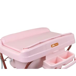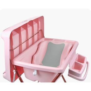- Trocador com estofado macio e suave ao toque, Assento redutor de profundidade para recém-nascidos, Porta-objetos removível com suporte para toalha, Gancho para guardar a cuba da banheira junto ao suporte, Mangueira para um prático escoamento de água.