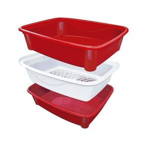 Banheira Vermelha Caixa de Areia Higiênica Gatos com 3 Peças Banheira Caixa de Areia Higiênica Gatos com 3 Peças ============================================================ Nunca foi tão prático manter a bandeja do seu felino higienizada, basta puxar a bandeja branca e pronto... A areia já está pronta para o próximo uso. Cada conjunto possui 2 bandejas para limpeza fácil, perfeita para quem não tem tempo e não quer se sujar. Utilize a bandeja Utilizado para peneirar sobre a bandeja extra e limpa. Muito fácil de higienizar, pode ser lavada com uma esponja e sabão neutro. Compatível com areia de gato fina comum, sílica fina, areia Biodegradável de mandioca, e também granulados de madeira. Para fazer uso com o granulado de madeira, você vai peneirar os grãos limpos, remover as fezes e eliminar a parte que saiu pelos buracos na peneira, podendo ser no vaso sanitário. ============================================================ Contém: 03 Peças 03 Bandejas + 01 Peneira Especificação: - Material: Polipropileno - Medida: 16cm x 37,5cm x 48cm - Evite desperdício de areia - Fácil de usar - Limpeza prática - Remove as impurezas sem o uso da pá - Cor: Vermelho ============================================================ Devido à diferença entre monitores e iluminação diferentes, pode haver variação na tonalidade apresentada no anúncio. Medidas muito aproximadas.