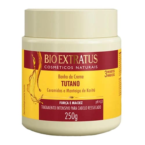 Linha Tutano - Força e Maciez Pioneira no uso do tutano em cosméticos capilares, a Bio Extratus desenvolveu uma linha completa para dar mais força e maciez. Indicação: Cabelo ressecado. Função: Limpar com suavidade, nutrir e hidratar intensamente. Resultados e Benefícios: Protege os fios, tornando-os mais saudáveis, macios e brilhantes. Ativos Karité: Previne o ressecamento dos cabelos. Protege das agressões mecânicas e climáticas, inclusive dos raios ultravioleta. Tutano: Rico em proteínas, nutre e fortalece profundamente o cabelo, hidratando e protegendo das agressões externas. Ceramidas: Restaura os cabelos danificados por condições estressantes, aumenta o brilho, a elasticidade e a resistência dos fios. Silicone: Confere brilho, proteção e sedosidade, proporcionando aparência saudável e natural ao cabelo. Queratina Vegetal Catiônica: Intenso poder de restauração. Banho de Creme Tutano Proteínas para hidratar, nutrir e fortalecer os cabelos. Enriquecido com de karité, que protege dos danos causados por agentes externos. Tem ação emoliente, contribuindo para a redução das pontas duplas em cabelos secos, desvitalizados e envelhecidos. Ph 4,0. Marca: Não Informado