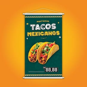 Design: O design do banner é vibrante e colorido, com a frase Aqui Temos Tacos Mexicanos em letras grandes e chamativas, acompanhada de ilustrações que evocam a rica cultura mexicana. As cores são cuidadosamente escolhidas para transmitir a alegria e a autenticidade da gastronomia mexicana, tornando-o não apenas um sinal, mas também uma peça decorativa que enriquece o ambiente.