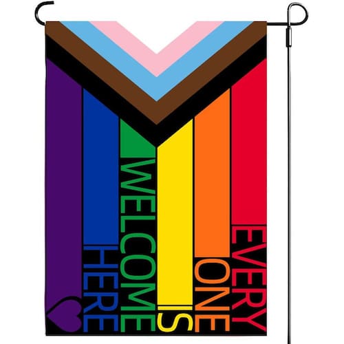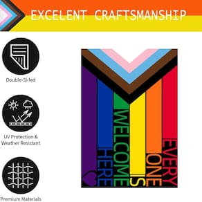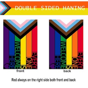 Banderas de jardín Progreso Pride "Todos Son Bienvenidos Aquí" - Bandera pequeña de jardín progresiva inclusiva de 12.5x18 pulgadas para LGBTQ, Lesbianas, Gays, Transgénero. - BANDERAS PROGRESO PRIDE SIN SOPORTE - La bandera progresiva "Todos son bienvenidos aquí" con franjas moradas, azules, verdes, amarillas, naranjas y rojas en forma de flecha junto con franjas rosadas y azules de la bandera transgénero, colgada con orgullo. - TAMAÑO DEL MATERIAL - La bandera de jardín es estándar de 12.5 x 18 pulgadas. Las banderas de jardín progresivas están hechas con impresión por sublimación y transferencia térmica de alta calidad, con un forro de material blackout. - DOBLE CARA - La bandera progresiva del orgullo tiene el mismo diseño por ambos lados, para que se vea igual de frente y de atrás. - EXCELENTE ARTESANÍA - Bordes doblemente cosidos que son lo suficientemente resistentes para uso diario, colores vivos y vibrantes con alta resolución de impresión. - OCASIÓN - Perfecto para jardín, césped, patio, casa de campo, terraza, patio trasero, buzón; una decoración duradera para tu hogar.