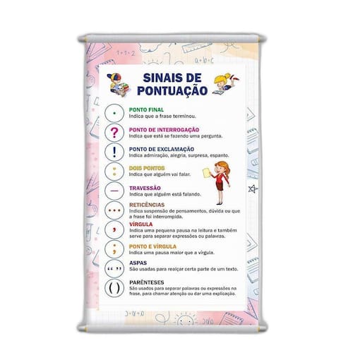 Este banner é uma escolha inteligente para quem procura unir decoração e educação, proporcionando uma forma prática e divertida de ensinar os sinais de pontuação. Seja para uso em escolas, como material de apoio para professores, ou para dar um toque de funcionalidade e estilo em qualquer ambiente, o banner de Sinais de Pontuação é uma solução versátil, durável e altamente educativa.