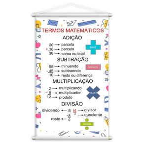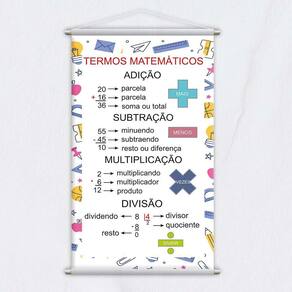 Transforme o ensino de matemática com o banner educativo Termos Matemáticos, uma ferramenta didática essencial para ensinar de maneira clara e visual os conceitos básicos dessa importante disciplina. Com 80x50cm, este banner de tamanho médio é perfeito para ser exibido em salas de aula, escolas de reforço, ambientes de estudo em casa ou em qualquer espaço educativo que precise de uma representação visual simples e eficaz dos principais termos matemáticos.