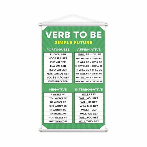 Especificações técnicas: - Tamanho: 60x40cm - Material: Lona de alta qualidade - Espessura: 340g - Bastões de madeira na parte superior para facilitar a fixação - Corda resistente para fácil exibição - Ideal para o ensino do Verbo To Be no Futuro Simples Ean: 7908716825630
