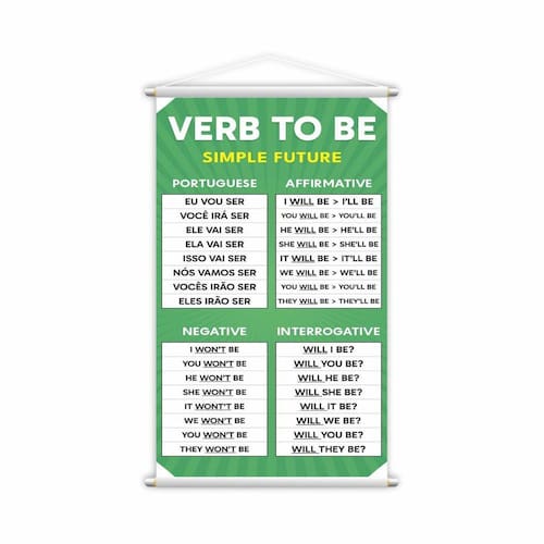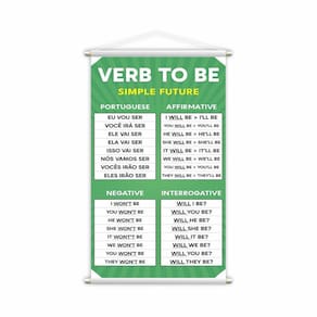 Especificações técnicas: - Tamanho: 60x40cm - Material: Lona de alta qualidade - Espessura: 340g - Bastões de madeira na parte superior para facilitar a fixação - Corda resistente para fácil exibição - Ideal para o ensino do Verbo To Be no Futuro Simples Ean: 7908716825630