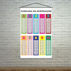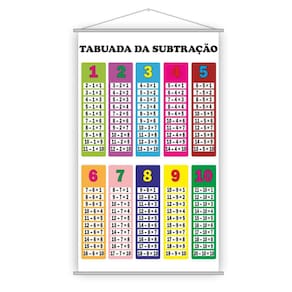 Banner Pedagógico Escolar Tabuada Da Subtração 80X50Cm TAMANHO: Banner com medida total de 80x50cm ACABAMENTO: Bastões de madeira + corda na parte superior. Atualmente existem diversas formas de aprendizado e a modernidade facilita e ajuda no desenvolvimento de cada passo escolar e pedagógico de uma criança. O banner pedagógico é uma delas, uma ótima forma de incentivar e começar a trabalhar a mente e praticar o aprendizado. Desenvolvemos diversos modelos de banners e cada um deles oferece apoio e ajuda no desenvolvimento em várias áreas. Quer ajudar os seus alunos a desenvolver esses aprendizados Os Banners Pedagógicos são excelentes para trabalhar de uma forma interativa o desenvolvimento dos alunos, facilitando na hora de ensinar e memorizar cada passo. Ean: 7908376105707