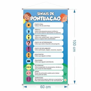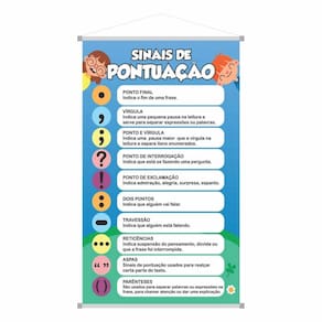 Características do Banner: Design Didático: Ilustrações expressivas representando diferentes sinais de pontuação, facilitando a compreensão visual. Texto Explicativo: Descrições concisas sobre a função de cada sinal de pontuação e como eles influenciam a estrutura e o significado das frases. Material Durável: Produzido em material resistente, garantindo uma ferramenta educacional de longa durabilidade. Tamanho Adequado: Dimensões pensadas para fácil visualização em salas de aula, permitindo que todos os alunos possam se beneficiar do conteúdo apresentado.