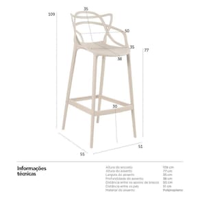Banqueta Allegra: Material: Polipropileno - Altura do encosto: 109 cm - Altura do assento: 77 cm - Largura do assento: 35 cm - Profundidade do assento: 38 cm - Distância entre os apoios de braços: 50 cm - Distância entre os pés: 51 cm - Peso suportado: 120 kg - Garantia: 3 meses.