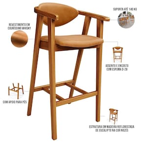 A melhor escolha para os momentos de confraternização no aconchego da sua casa, acaba de chegar! A Banqueta Alta Para Cozinha Bancada Bar Sala de Jantar Fixa Cecília L02 Couríssimo Whisky - Lyam vem com a personalidade e elegância que sua decoração merece! É ideal desde refeições rápidas, até um Happy Hour com os amigos, família. Seu design único valoriza o ambiente, sem deixar pra trás a beleza e qualidade! Para deixar a sua área gourmet mais aconchegante, ela possui assento e encosto estofados, confeccionados com materiais de excelente qualidade, e extremamente resistentes.