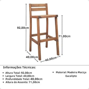 A Banqueta Alta Rústica possui o benefício de ser confeccionada totalmente em Madeira Maciça Eucalipto, material resistente que garante alta resistência e durabilidade ao produto.