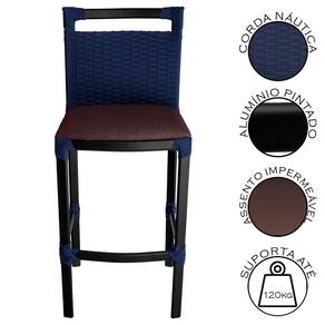 Banqueta Alta Vigor Em Alumínio E Corda Náutica Azul Azul Com Marrom A Banqueta Vigor acrescenta um charme unico a qualquer espaco, sendo ideal para quem busca combinar funcionalidade e estilo em ambientes externos. Produzida com material de alta qualidade e feita de forma artesanal. Sua estrutura e composta por aluminio e acabamentos em corda nautica, combinando durabilidade com estilo contemporaneo. Possui encosto fixo em corda nautica, que oferece um apoio confortavel enquanto adiciona um toque de design unico. Alem disso, o assento e estofado impermeavel garantindo conforto e praticidade, sendo adequada para areas externas, como areas gourmet, espacos de churrasqueira, ediculas e outros ambientes ao ar livre. ESPECIFICACOES TECNICAS: - Material da Estrutura: Aluminio; - Material do Assento: Estofado impermeavel; - Material do Encosto: Corda nautica; - Possui Braco? Nao; - Possui Regulagem de Altura? Nao; - Quantidade de Lugar: 01 Lugar; - E Giratoria? Nao; - Suporta ate: 120 kg; - Garantia: 3 Meses; - Necessita de Montagem: Nao; - Instrucoes de Cuidado: Nao utilizar produtos quimicos na fibra e nem na estrutura para limpeza, somente pano macio umedecido com agua e sabao neutro; - Dimensoes do Produto (LarguraXProfundidadeXAltura): 45x45x110cm; - Peso do Produto: 4,80 kg; - Conteudo da Embalagem: 01 Banquetas; Marca: ACESSE MÓVEIS