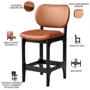 Amplamente sofisticada, a Banqueta Baixa Bar Cozinha Sala Jantar Betta L02 Couríssimo Camel - Lyam Decor irá agregar ainda mais valor em sua decoração!! Sendo capaz de compor muito bem o ambiente, é produzida com materiais de excelente qualidade, a resistente estrutura em madeira de Taeda, na cor Preto, conta com apoio para os pés (que garante maior segurança), além do assento e encosto estofados super confortáveis e convidativos, que são revestidos em tecido Couríssimo, composição extremamente elegante.