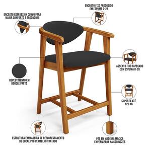 Características: Estrutura em madeira de reflorestamento de eucalipto vermelho tratado. Revestimento em tecido Bouclê de alta qualidade na cor Preto. Assento e encosto fixos tapeçados com espuma D-28. Encosto com design curvo para maior conforto e ergonomia. Pés em madeira maciça envernizada na cor Nozes. Peso suportado: Até 120 kg.