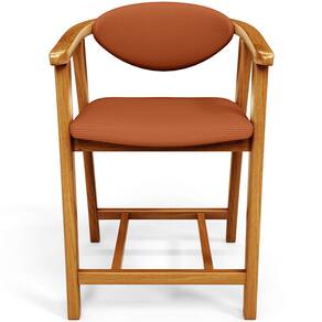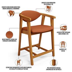 Características: Estrutura em madeira de reflorestamento de eucalipto vermelho tratado. Revestimento em tecido terracota Assento e encosto fixos tapeçados com espuma D-28. Encosto com design curvo para maior conforto e ergonomia. Pés em madeira maciça envernizada na cor Nozes. Peso suportado: Até 120 kg.